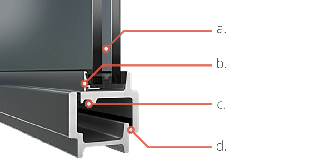 The detailed 3D rendering on the left highlights the important features that comprise our W20 series windows and doors. These features include: the (a) Glazing pocket for Glass up to 15/16” (24 mm) total thickness, the (b) Glazing Bead (shown is the Flat bead style) which may be used on the interior or exterior frame surface, the (c) Interior EPDM sealing gasket and weep system, and the (d) Exterior rebated EPDM sealing gasket.